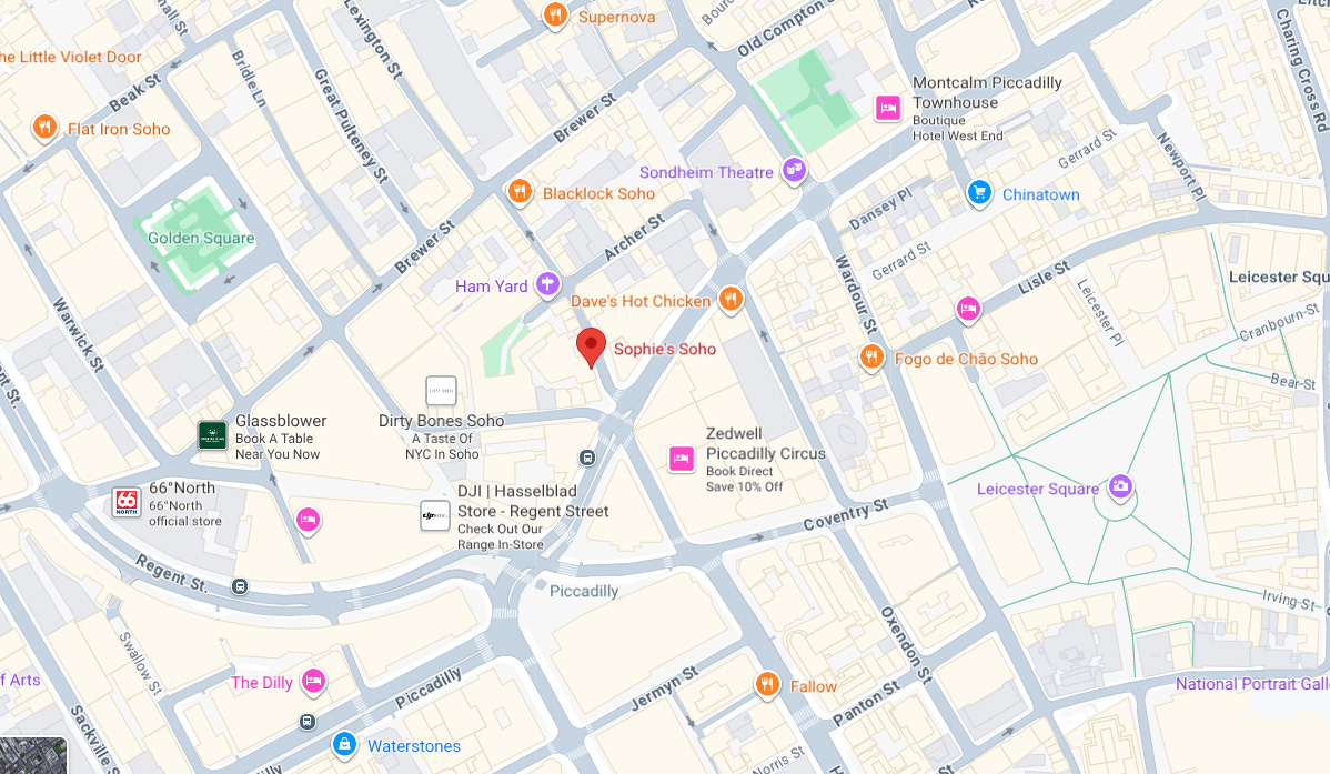 Sophie’s is so central you honestly wouldn’t believe it. That’s Picadilly Circus just below it. That’s Leicester Square just to the right.